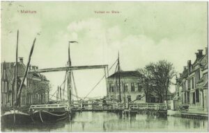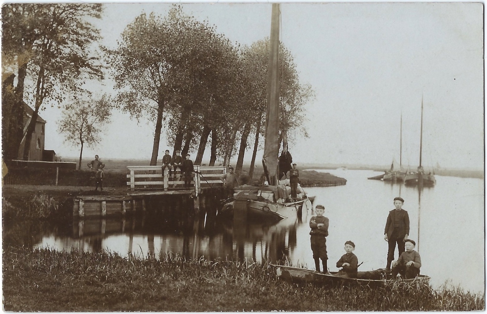 Soe der in Fryske Huckleberry Finn bestean, dan koe dizze foto sá op it omkaft. Mar it is fansels net de Mississippi dy’t wy hjir sjogge. It is, sa’t de ôfstjoerster al skriuwt, it kanaal by Suwâld, om krekt te wezen it plak wêr’t hjoeddedei it Van Harinxmakanaal oanknopet by it Prinses Margrietkanaal. Suwâld hie dêr in opslach, in oanlisplak foar skûtsjes foar it laden en lossen fan bygelyks turf en terpierde. In fariant fan ús fotokaart, wêrfan’t in eksimplaar yn Tresoar bewarre wurdt, hat dan ek as byskrift ‘Opslag, Suawoude’. Dy opslach lei foar it noch besteande Bakkershûs oan de Suderein, dat yn 1814 set waard yn opdracht fan bakker Bouwe Daniëls van der Meulen. Links op de foto is noch in stikje fan dat Bakkershûs te sjen.