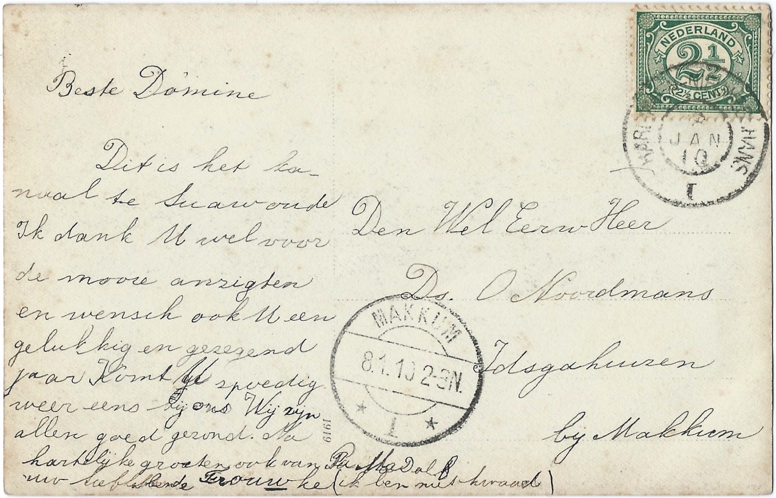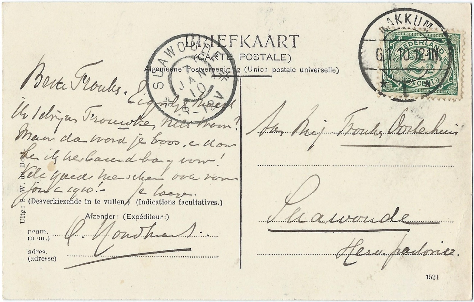 Eigenlijk moest ik schrijven Frouwke, niet waar? Maar dan word je boos, en daar ben ik verbazend bang voor! Vele goede wenschen ook voor jou in 1910! Je toegen.