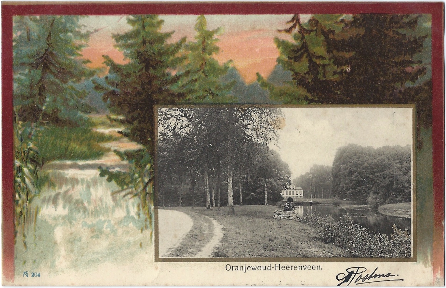 - ‘Oranjewoud-Heerenveen.’ (m.û.), ±1901–1902. Kleurelitografy en ljochtdruk, 91×140 mm. Utjûn troch de Heerenveensche Boek- en Kunsthandel, It Hearrenfean. Printe troch Knackstedt & Näther, Hamburch, searje 204. Poststimpels It Hearrenfean 25-10-1902 en Almelo 25-10-1902. Ferstjoerd oan Adriana Catharina Pauline Calkoen, Almelo, troch Ida Elisabeth van Heloma.