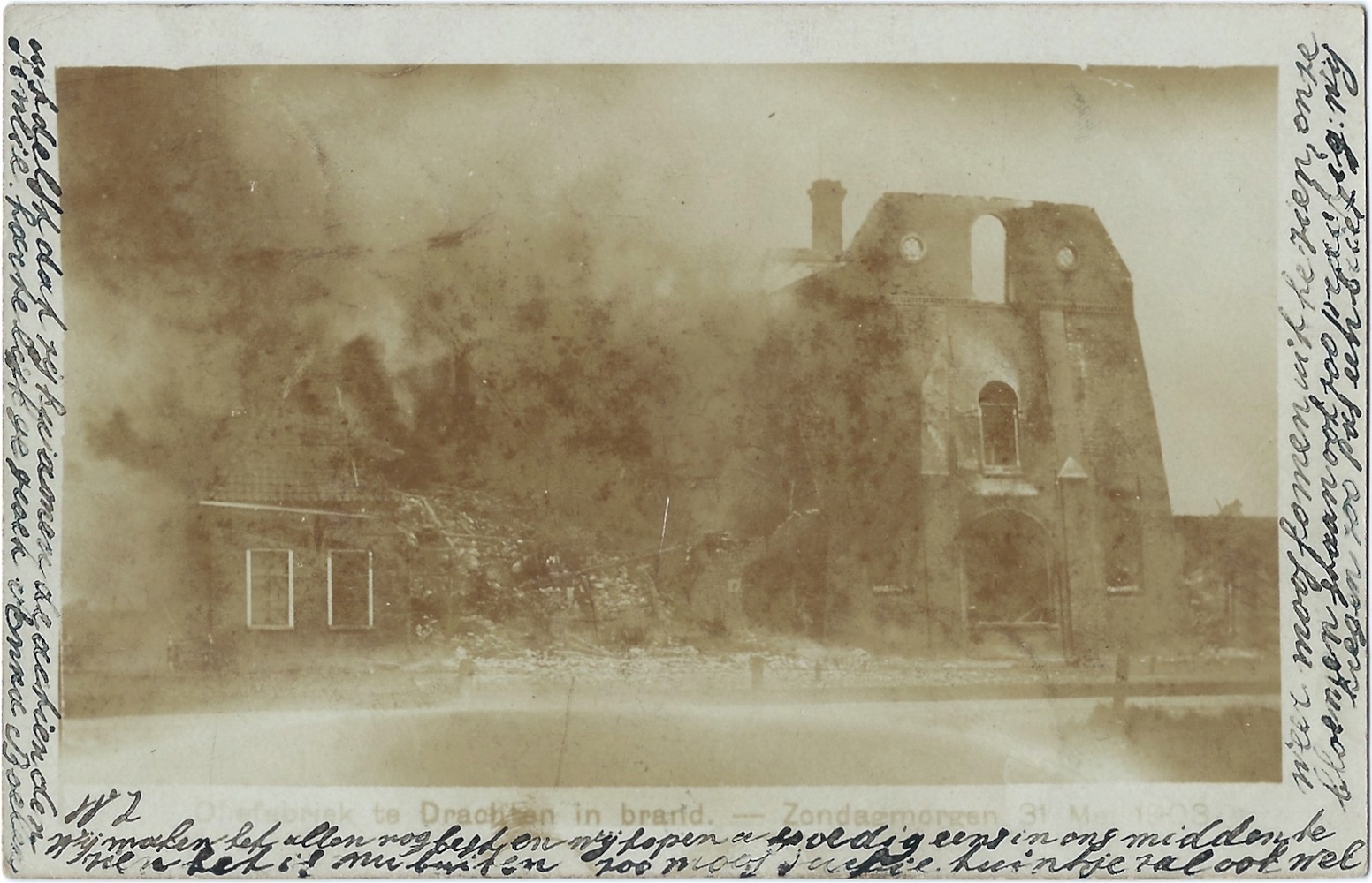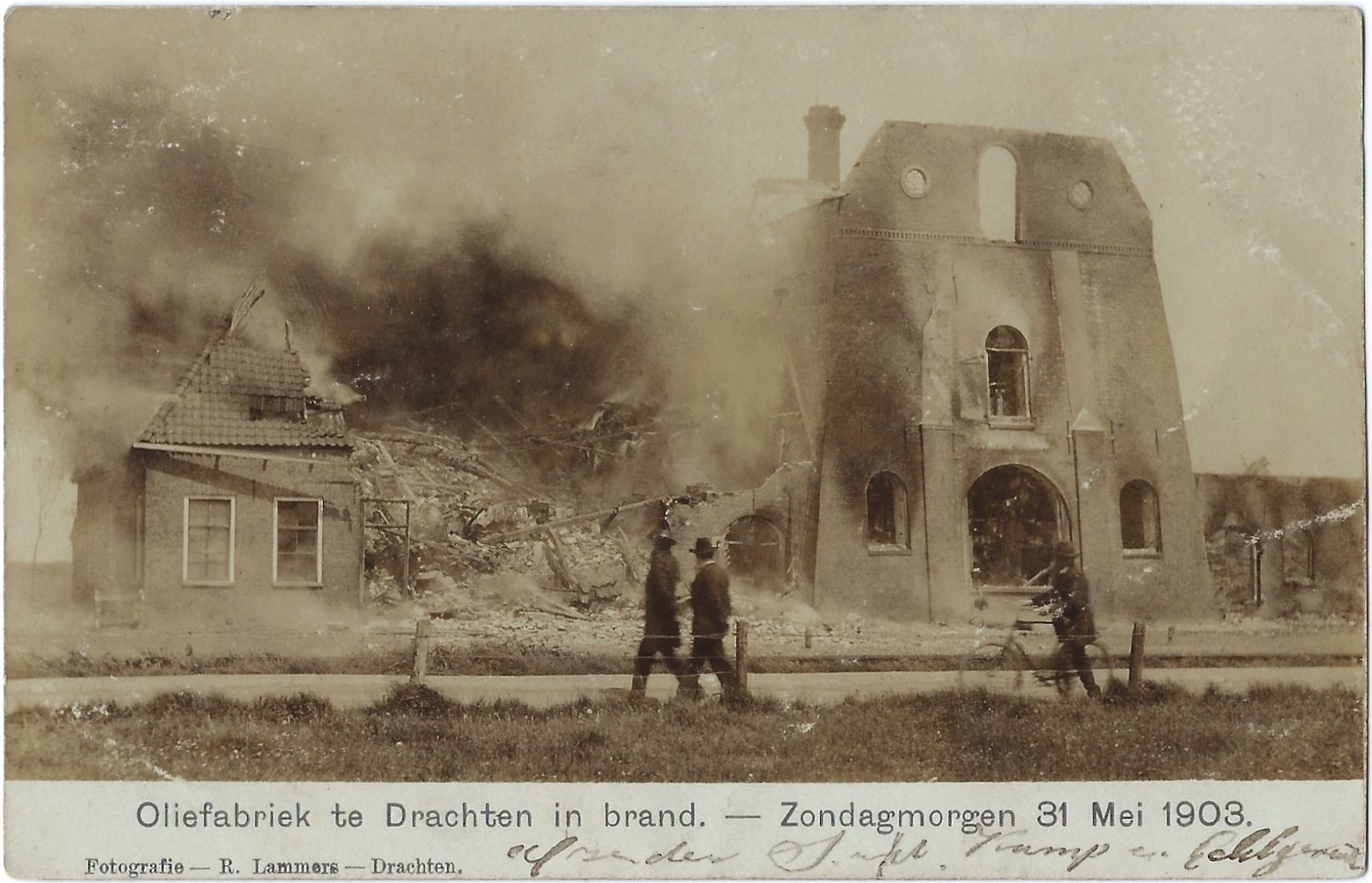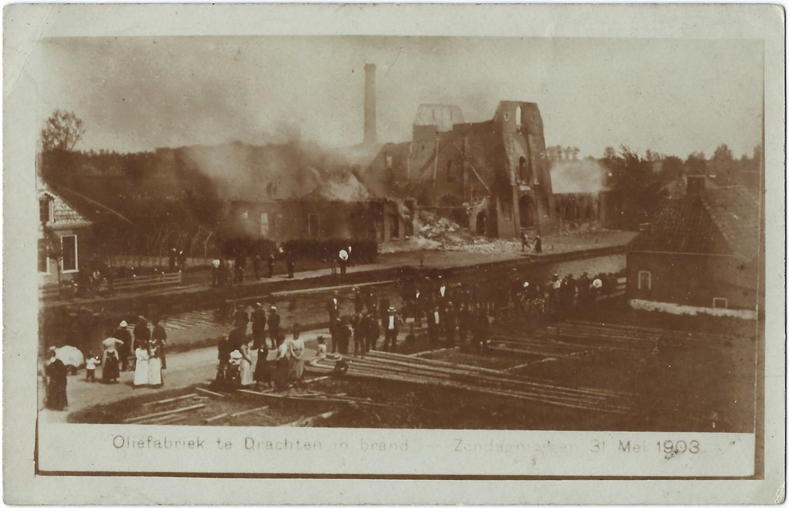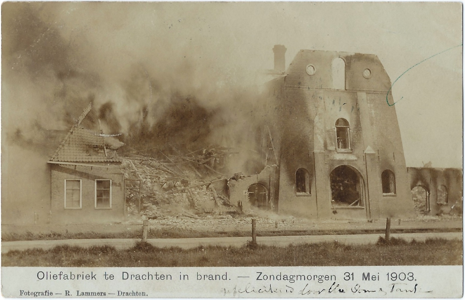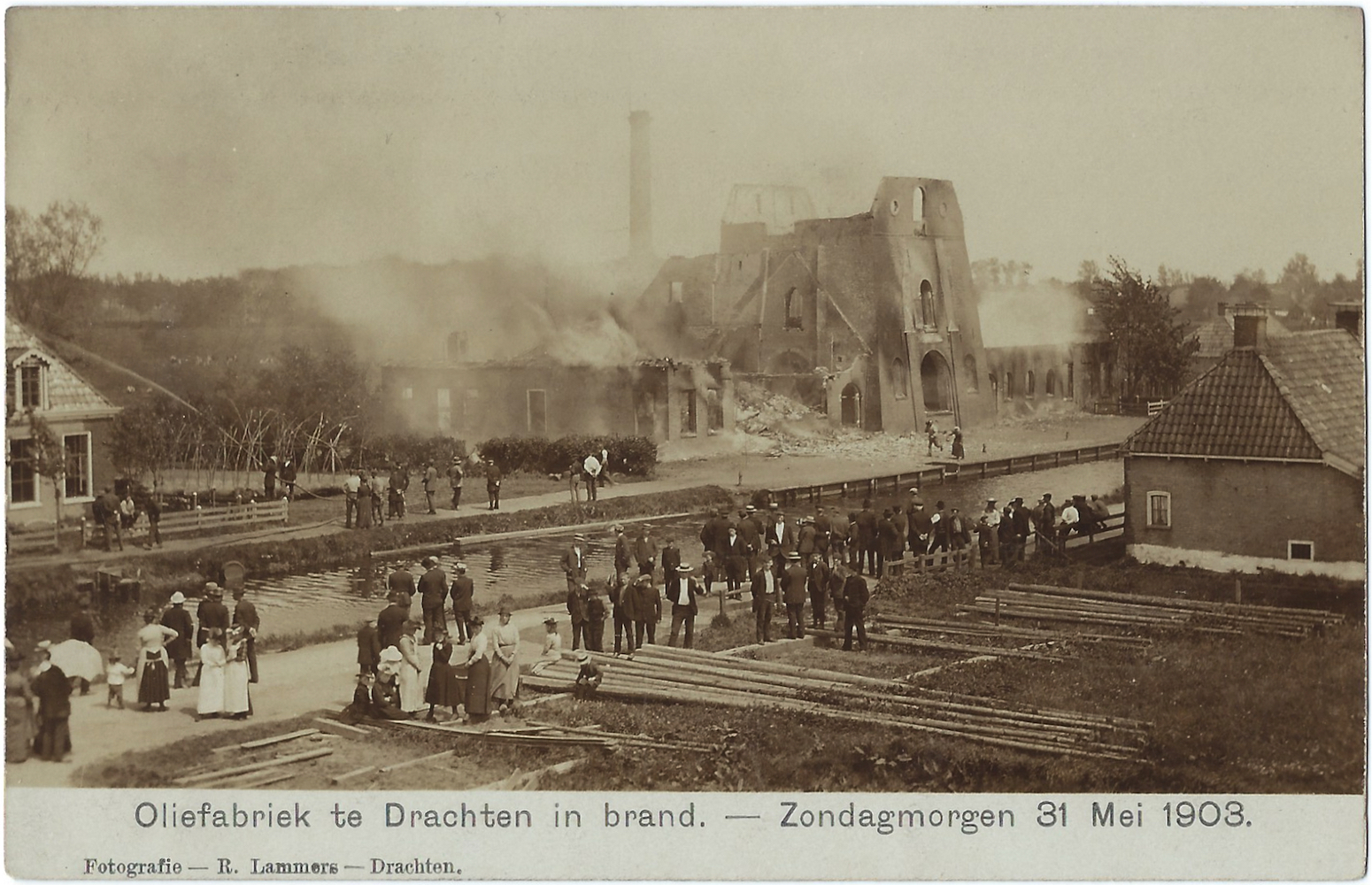 ‘Oliefabriek te Drachten in brand. – Zondagmorgen 31 Mei 1903.’ (m.û.), 1903. Fotokaart, 90×140 mm. Sûnder fermelding fan in útjouwer. Poststimpels Drachten 08-06-1903 en Ljouwert 08-06-[1903]. Ferstjoerd oan Trijntje Boelens, Ljouwert, troch Antje Boelens.