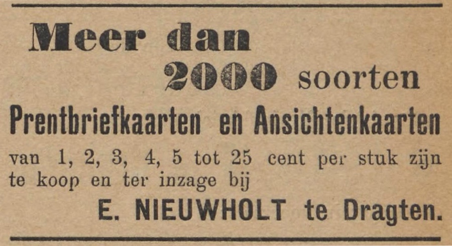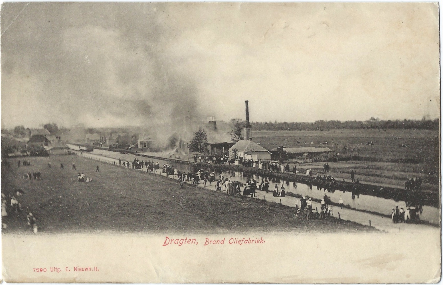 Dy beide ansichten waarden op ’e merk brocht troch noch wer in tredde útjouwer: Ebele Nieuwholt (1859–1925), dy’t syn wurksume libben begûn as klerk op de gemeentlike sekretary, mar letter aktyf wie as drukker, as ferkeaper fan boeken en kantoarartikelen en as útjouwer fan ansichtkaarten fan Drachten en omkriten. Eabele hie in winkel oan de Noardkade. Hy brocht fan de brân twa reguliere kaarten út, yn ljochtdruk, mei byskriften yn boekdruk (printe mei leadsetsel dus, hjir yn read). De iene kaart is bysûnder fanwegen it fûgelflechtperspektyf; soe de foto út in loftballon wei makke wêze? Op de oare ansicht falle de trije famkes hielendal links op: harren oandacht giet net út nei de enoarme reekkolom achter harren, mar nei de fotograaf… wy komme op de kyk!