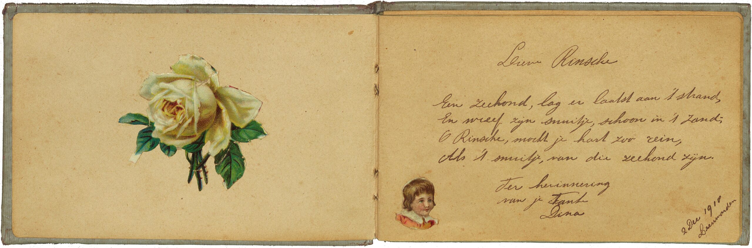 1. Dina Graeler, Ljouwert, 02-12-1918. In tante fan Rinske. Gedicht, 4 rigels, earste rigel ‘Een zeehond, lag er laatst aan ’t strand’.