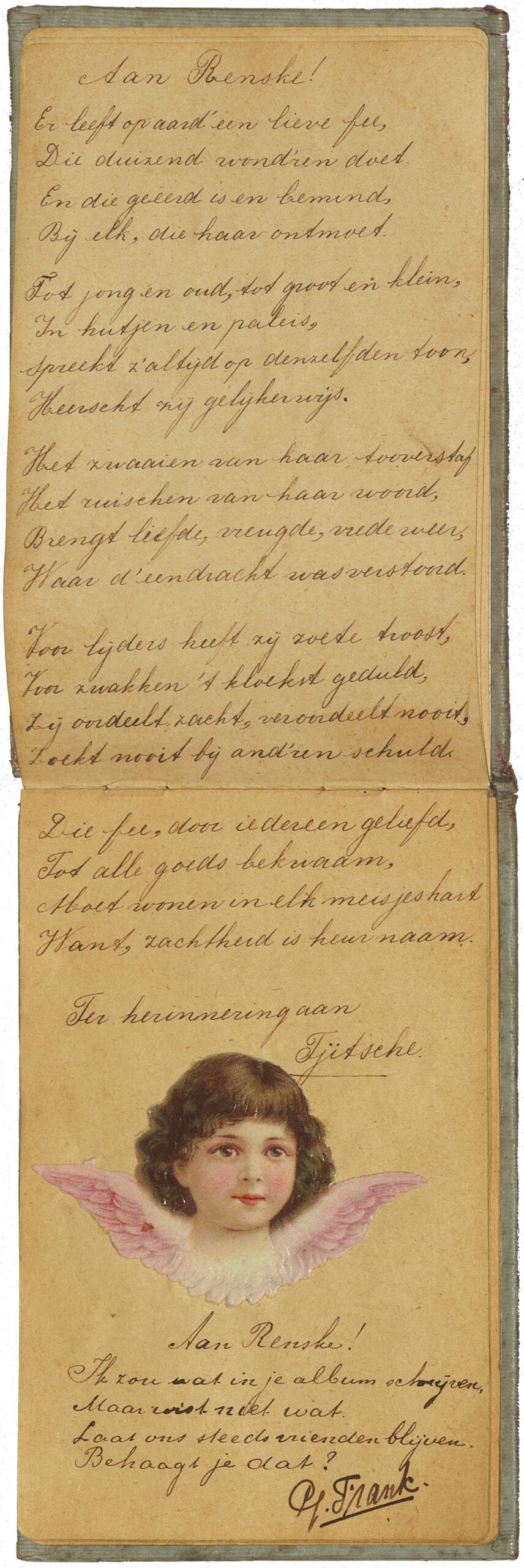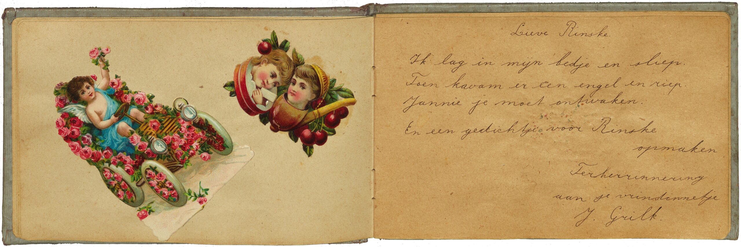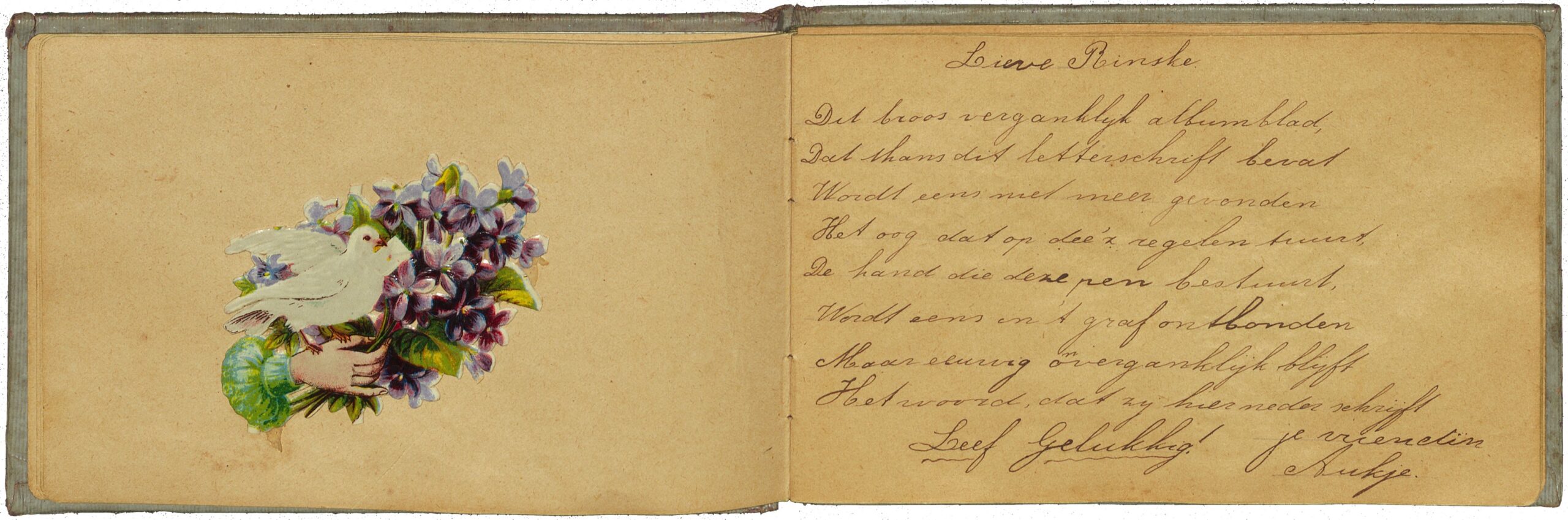 Twa dingen falle by dit poesyalbum daalk op: it langwerpige formaat en it romantyske plaatsje op it bantsje. Beide gripe op âldere tradysjes werom. De eigner fan it album wie lykwols har tiid foarút: sy bruts letter as wurkjende frou mei in wichtige baan by ‘de Kondens’ yn Ljouwert troch it glêzen plafond.