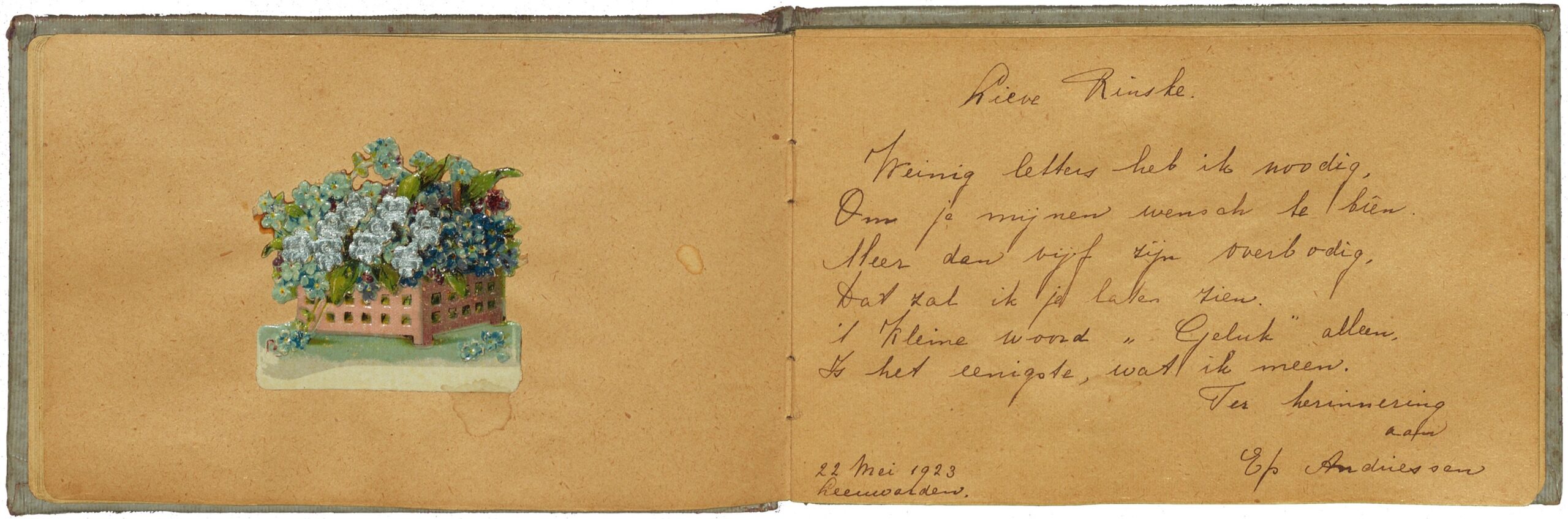7. Elisabeth (Ep) Andriessen, Ljouwert, 22-05-1923. Buorfamke; wenne op it adres Achter de Hoven 83. Gedicht, 6 rigels, earste rigel ‘Weinig letters heb ik noodig’.9