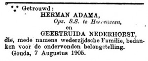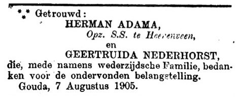 Op hoop fan segen… It houlik fan Herman Adama en Geertruida Nederhorst liket op ’en doer net lokkich west te hawwen. Doe’t Herman yn 1955 ferstoar, wie er neffens de dea-akte noch altyd ‘echtgenoot van: Nederhorst, Geertruida’, mar fiif jier earder hie er yn it Nieuwsblad van het Noorden kundskip dien fan it ferstjerren fan ‘onze lieve Vrouw, Moeder, Zuster en Behuwdzuster’ Cornelia Adriana Zandee (1896–1950). ‘Uit aller naam’, skreau Herman derby; ûnder syn namme steane noch twa foarnammen. Yn Cornelia har dea-akte wurdt net melding makke fan in echtgenoat, in fermelding dy’t by troude lju wol ferplichte wie. Blykber hienen Herman en Cornelia in relaasje sûnder troud te wêzen en wennen se, mei twa bern fan Cornelia, by inoarren yn Grins.