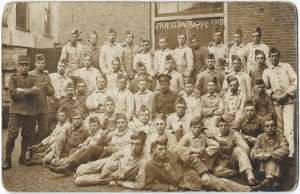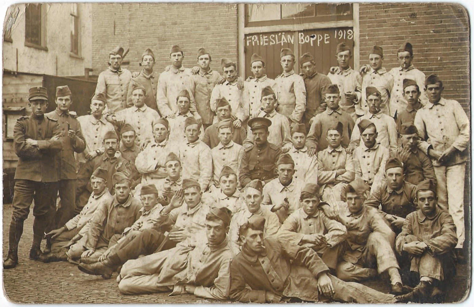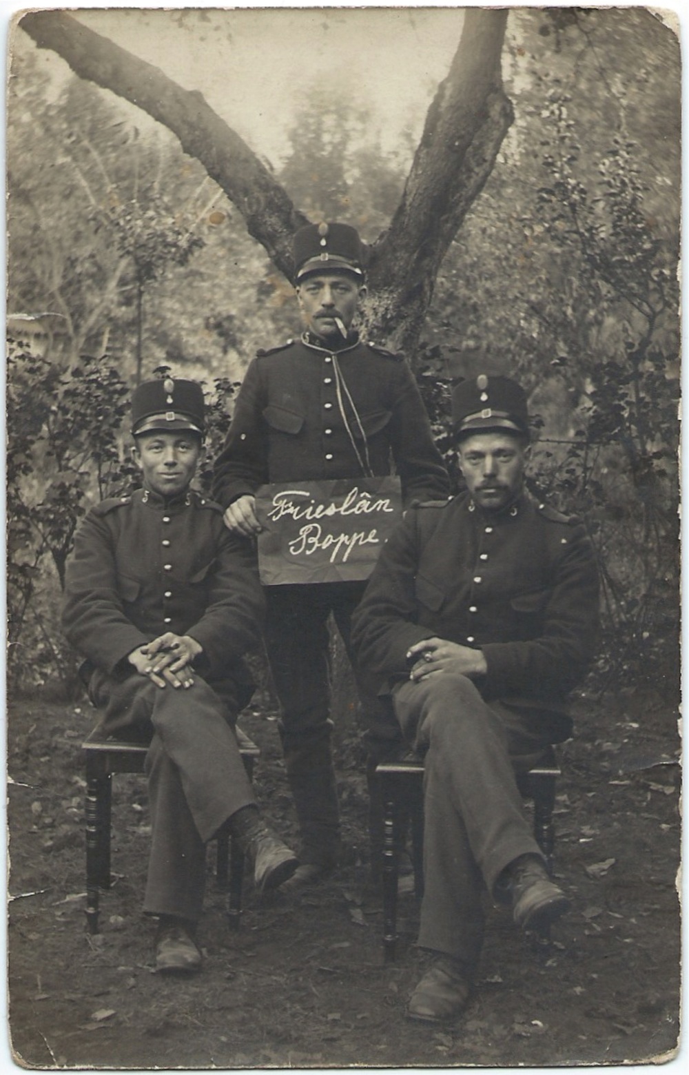 It wie in tiid dat je fan smoken noch gjin kanker of hertkwalen krigen. Fyftjin fan de njoggentjin Fryske lânstoarmers op de kaart fan Yme lieten harren ferivigje mei in piip of sigret yn ’e mûle. Opfallend, mar net útsûnderlik, is ek de tekst ‘Frieslân bôppe!’ dy’t mei kryt op it boerd skreaun is. Ik haw no mei-inoar fiif ‘soldatekaarten’ mei dy tekst, lykas de net ferstjoerde fotokaart hjirnêst, makke yn 1918 (of mei soldaten fan de lichting 1918), wêrby’t it ‘FRIESLÂN BOPPE’ op de doarren achter de mannen liket te stean, mar yn werklikheid op it negatyf fan de foto tafoege is. It moaiste foarbyld is de net ferstjoerde fotokaart hjirûnder, mei trije soldaten – ien mei in piip yn ’e mûle, de oare twa mei in sigaar yn ’e knûst – dy’t neffens in notysje op de achterkant yn 1914 legere wienen yn Noard-Brabân. Ek hjir liket de tekst ‘Frieslân Boppe’ tafoege te wêzen op it negatyf.