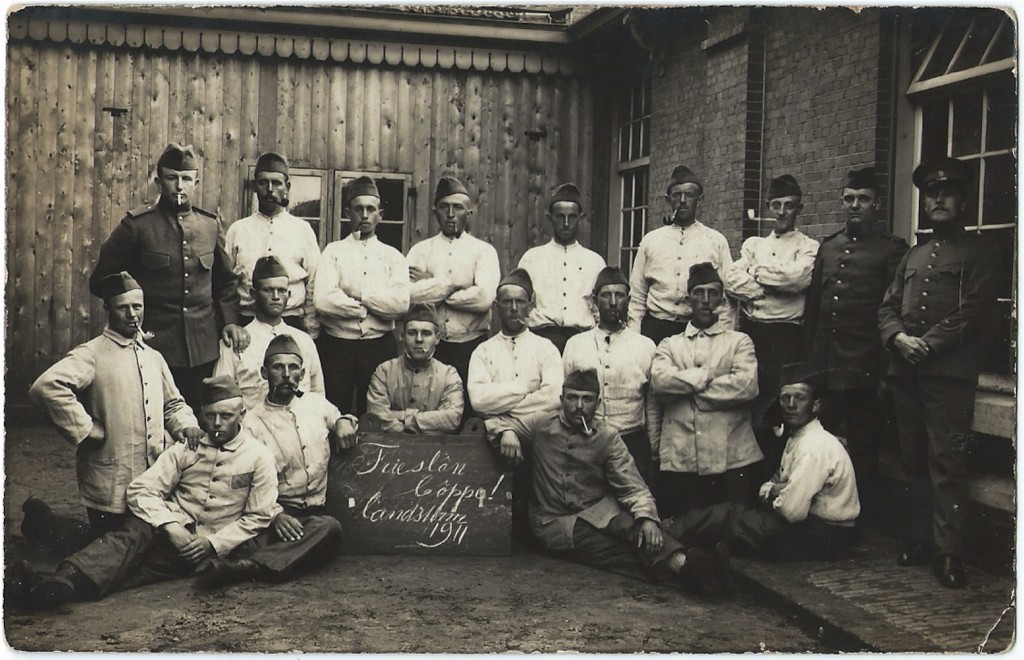 De soldaten op Yme syn kaart binne nammers gjin beropsmilitêren of tsjinstplichtigen, mar leden fan de Lânstoarm: in ‘reserveleger’ fan frijwilligers dy’t frijsteld of útlotte wienen foar militêre tsjinst. Se binne, neffens de tekst op it boerd dat se toane, fan de lichting 1911. Mar de foto is sûnder mis makke wylst se al mobilisearre wienen. Op ynternet is in oare fotokaart te finen fan in groep Oeriselske lânstoarmers tsjin deselde achtergrûn.