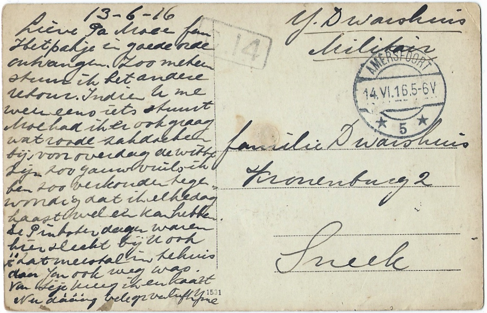 Fergelykber mei it fersyk dat Yme syn mem die, is de needgjalp dy’t in M. Rikkers, legere yn Ljouwert, yn 1915 stjoerde oan syn âlden yn Neder-Hardinxveld – op legerkistjes de stêd yn, dat kin ommers net heal! Hy skreau syn driuwende oprop achterop in ansicht mei de Ljouwerter Huzumerleane: