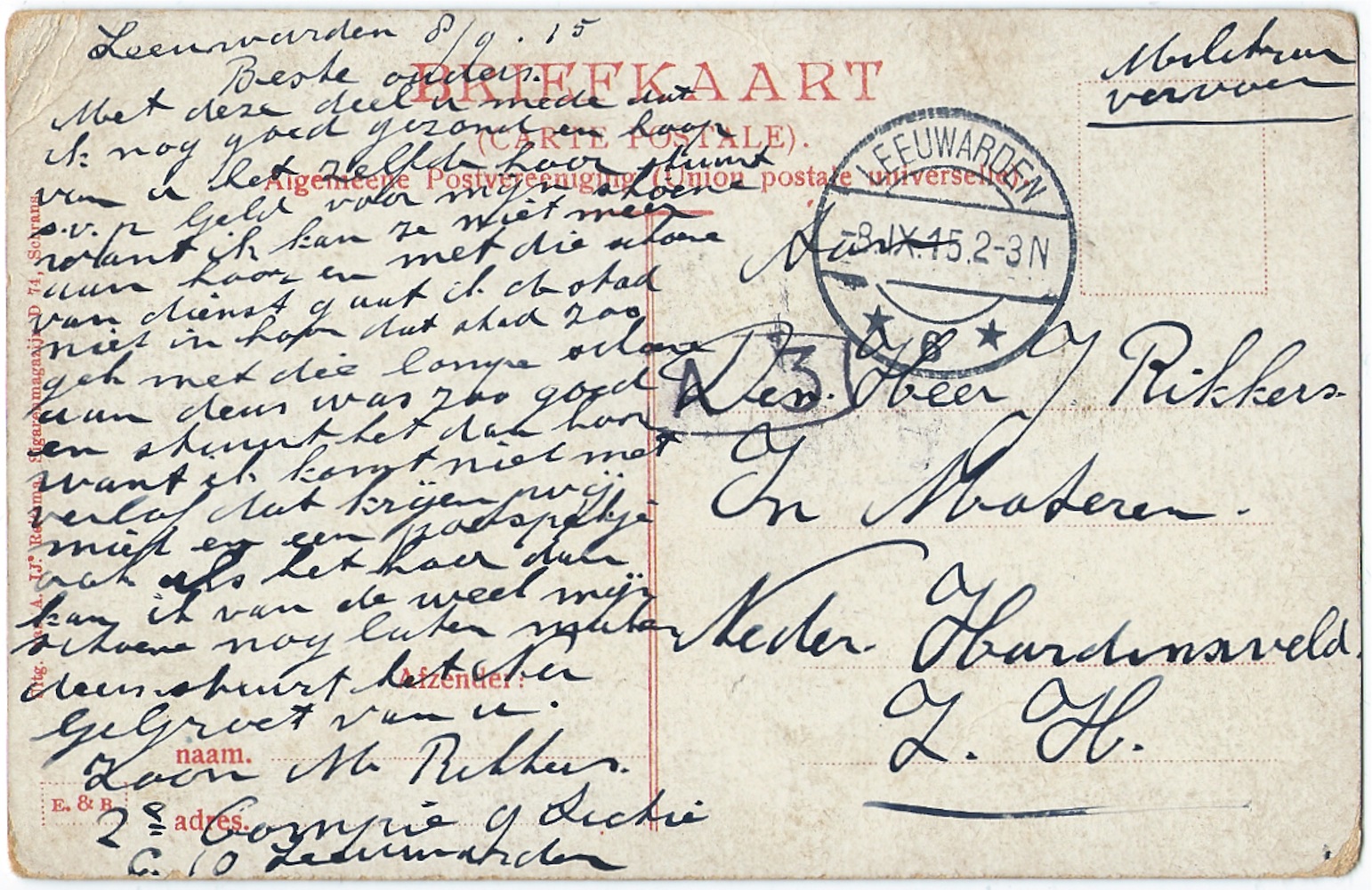Het pakje in goede orde ontvangen. Zoo meteen stuur ik het andere retour. Indien U me weer eens iets stuurt Moe had ik er ook graag wat roode zakdoeken bij, voor overdag de witte zijn zoo gauw vuil, ik ben zoo verkouden tegenwoordig dat ik elke dag haast wel een kan hebben. De Pinksterdagen waren hier slecht bij U ook ’k Zat meestal in tehuis daar Jan ook weg was. Van Sije kreeg ik een kaart
