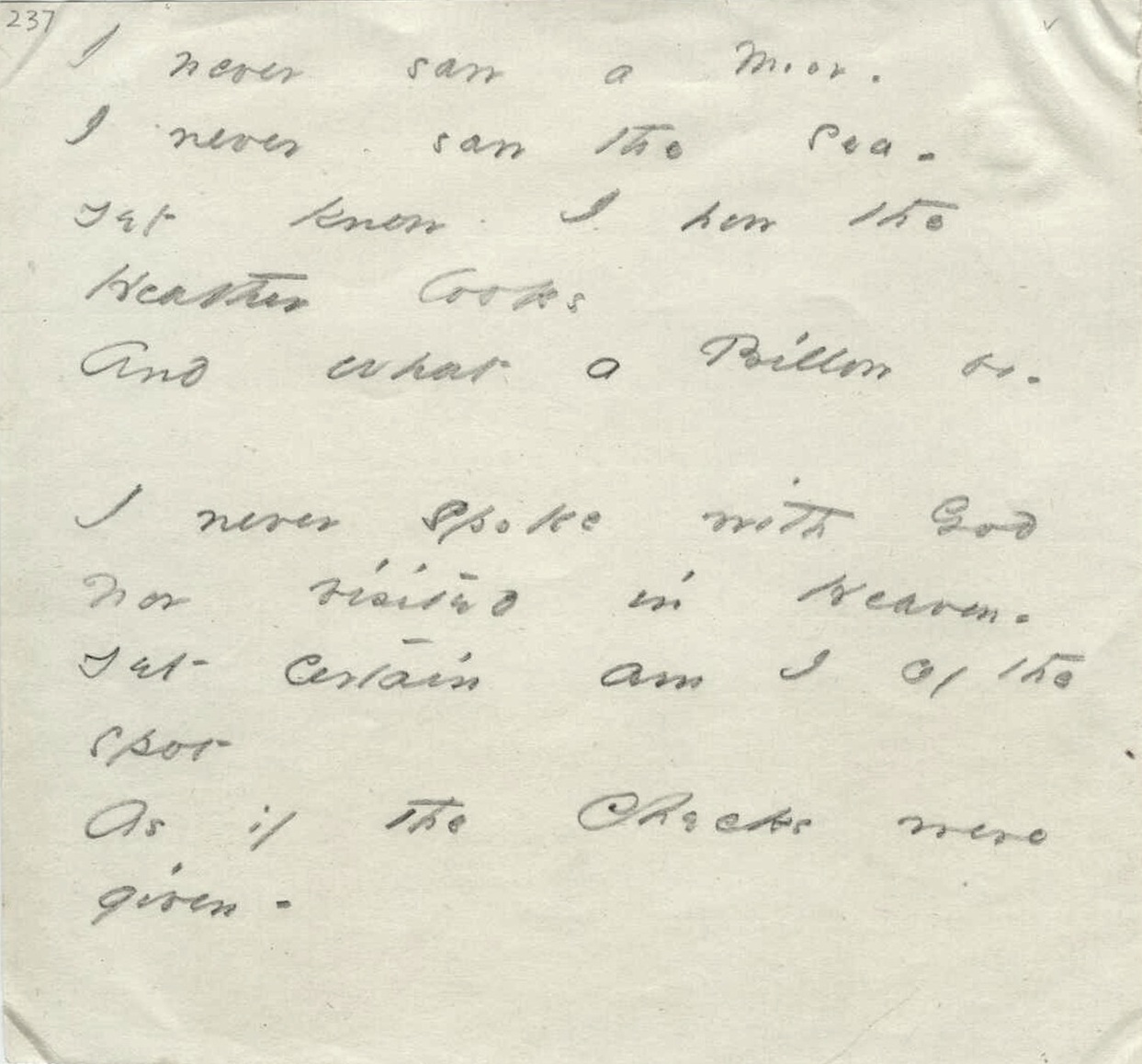 F800 (J1052). Ofbylding: Amherst College Library, Emily Dickinson Collection, 237. YouTube: Plastique Cathédrale, ‘I never saw a Moor’, 2014.