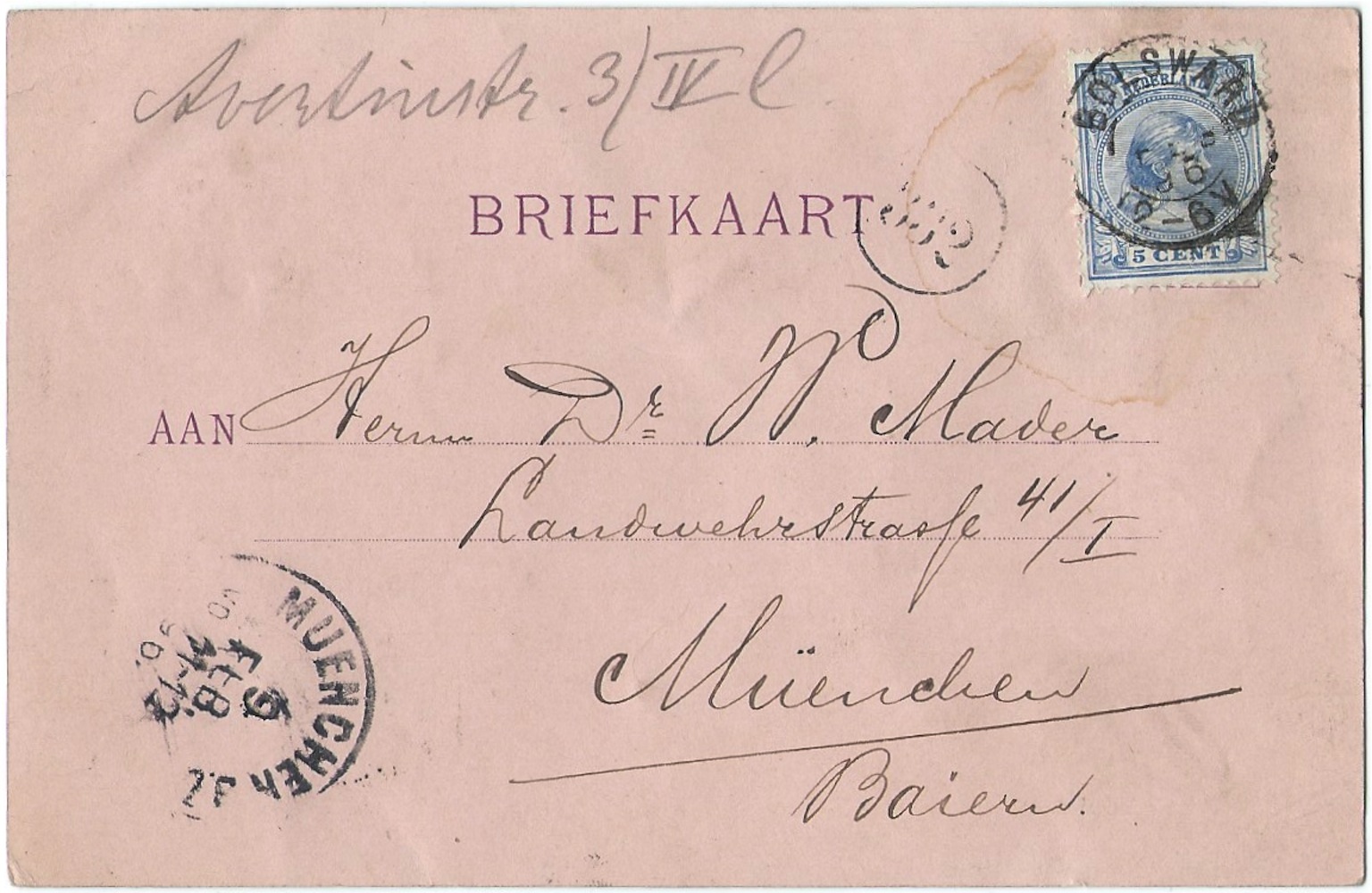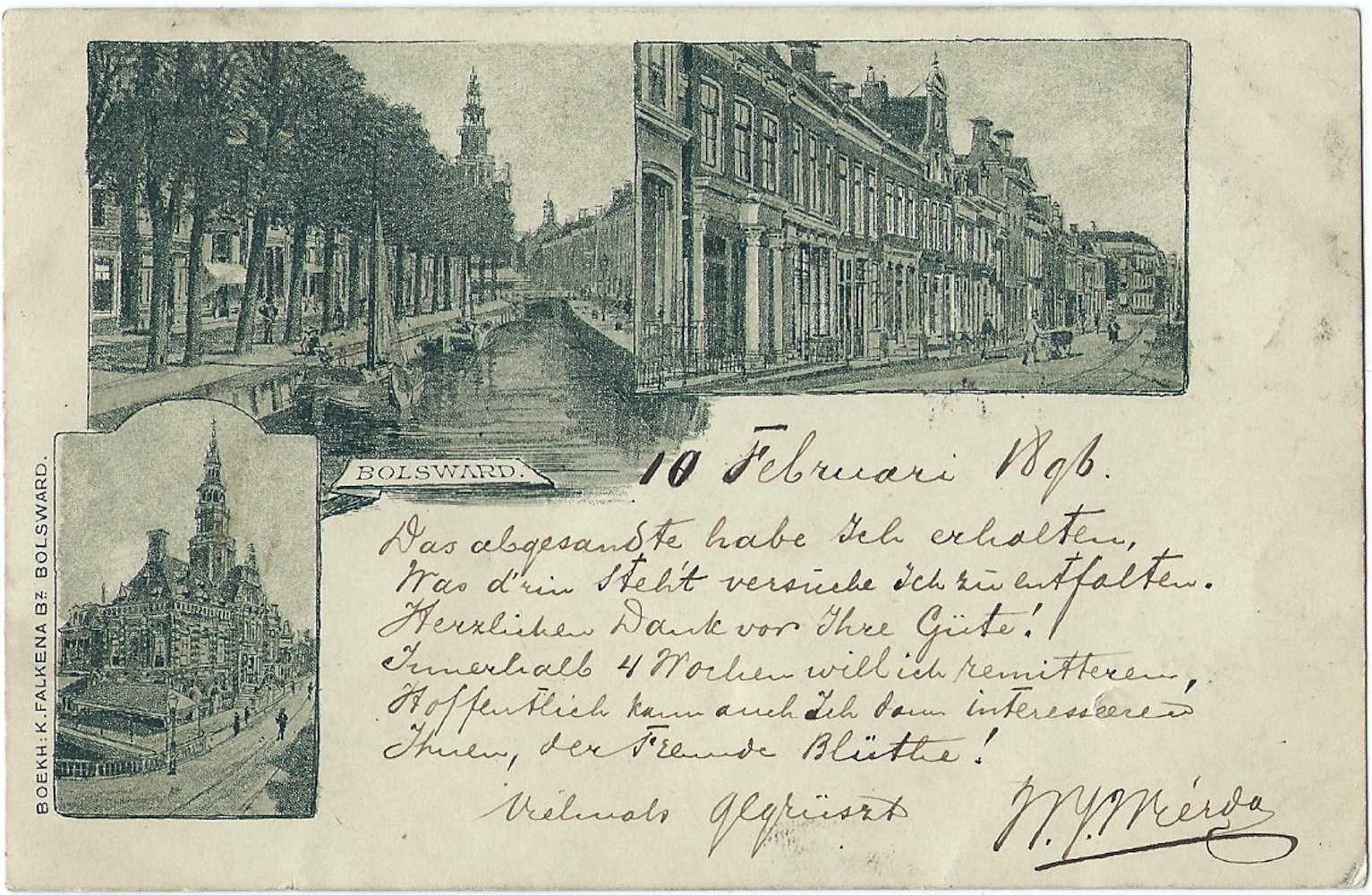 Wierda en Mader hawwe yn Boalsert grif in freonskiplike omgong hân. Wierda skreau op de foarkant fan de ansicht in hertlik boadskip op rym, yn syn bêste, mar net flaterfrije Dútsk. De deitekening is mei rommele. De sekuere lêzer hat fansels al opmurken dat de datum ‘10 Februari 1896’ boppe Wierda syn rymstikje in dei letter is as de datum dy’t yn it Münchener postkantoar op de kaart stimpele is. Ien fan beide datearrings kin dan net klopje. En jawol, de ‘10’ liket oer in oar getal, mooglik in ‘6’, hinne skreaun te wêzen. Hat Wierda yn ’e beane west en de datum ferkeard ‘ferbettere’? Of hat Mader de datearring oanpast om der op dy manier in datum fan ûntfangst fan te meitsjen?