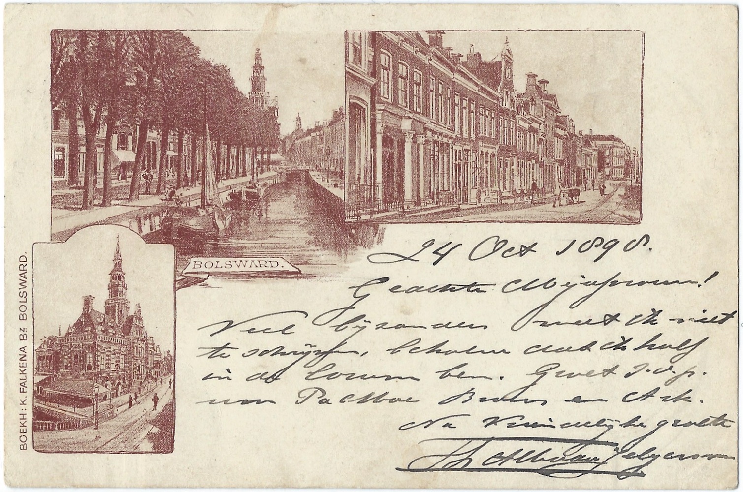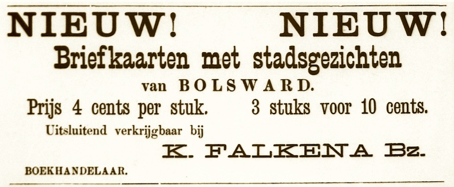 De beide kaarten binne útjûn troch Klaas Baukes Falkena (1852–1932), dy’t sûnt 1891 in boekhannel dreau oan de Jongemastrjitte, tsjinoer it stedhûs. Falkena wie de earste yn Boalsert – en sa’t it liket de earste yn hiel Fryslân – dy’t ansichtkaarten op ’e merk brocht. Al op