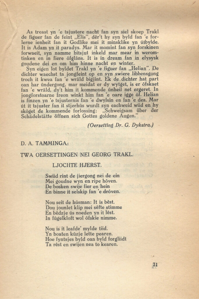 Mar net minder nijsgjirrich binne de oersettings, mei-inoar acht, dy’t foar 2020 yn it Frysk ferskynd binne. De earste Trakl-oersetter yn it Frysk wie der betiid by: yn 1929 publisearre Theun de Vries (1907–2005) yn de fjirde en lêste jiergong fan it tydskrift