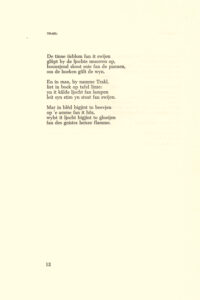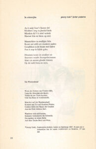 30 It fers befettet karakteristike Trakl-bylden (snie op in dak, in beevjend blêd, stilte dy’t by in muorre opklimt) en yn de lêste rigels, ‘wylst it ljocht bigjint to gloeijen / fan des geistes heisze flamme’, wurdt út de foarlêste rigel fan Trakl syn ferneamde fers ‘Grodek’ sitearre: ‘Die heiße Flamme des Geistes nährt heute ein gewaltiger Schmerz, / Die ungebornen Enkel.’ It fers waard opnommen yn blomlêzings