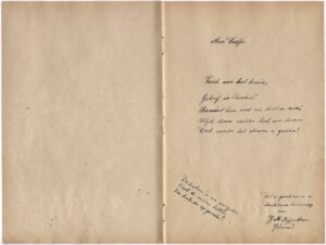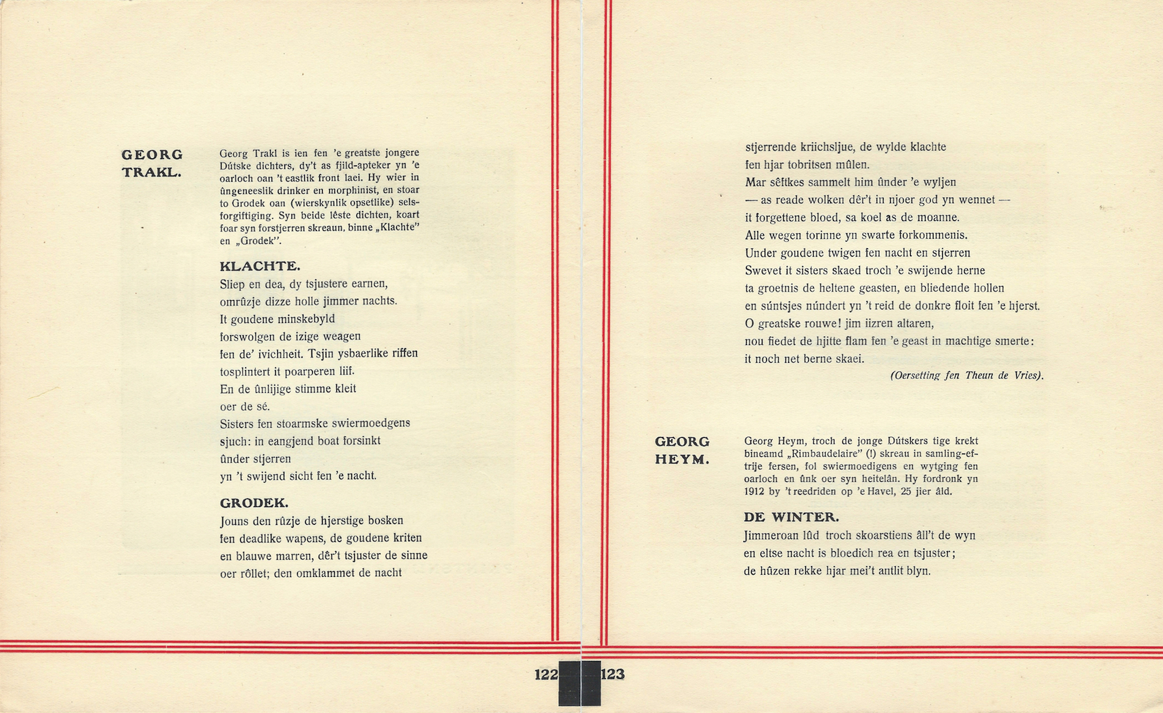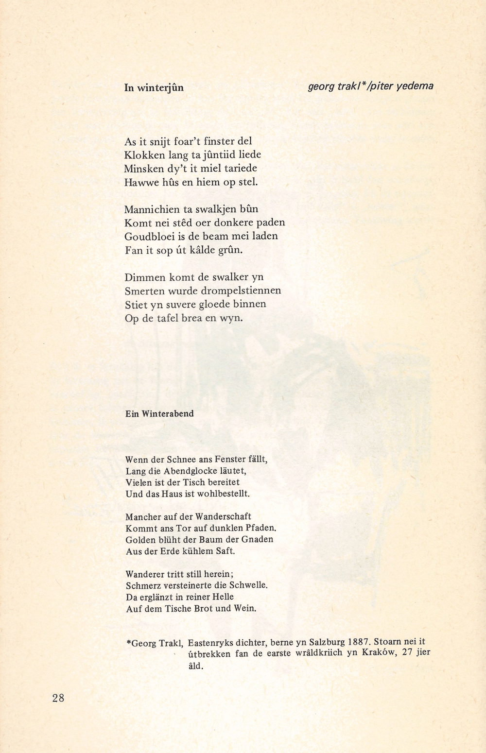 Fan Trakl hie ik as studint wolris wat lêzen doe’t ik in rige kolleezjes oer de dichter Hendrik Marsman folge. Dy wie yn syn iere wurk beynfloede troch Trakl en skreau yn 1923 in begeastere essee oer him yn De Gids.3 Ik lies Trakl doe, om 1980 hinne, yn it Dútsk. Hollânsktalige oersettings wienen der inkeld fan wat losse gedichten, ferspraat yn periodiken. Bondels mei in substansjeler tal oersettings ferskynden pas fan 1981 ôf, fan de hân fan Huub Beurskens,4 Jattie Enklaar-Lagendijk,5 Frans Roumen,6 C.O. Jellema,7 Stefaan van den Bremt8 en de germanist Jan Ulbe Terpstra (1912–2004).9 De oersettings fan de lêste binne nei myn betinken it bêste slagge. De widzen fan syn heit en mem hienen nammers yn Fryslân stien.