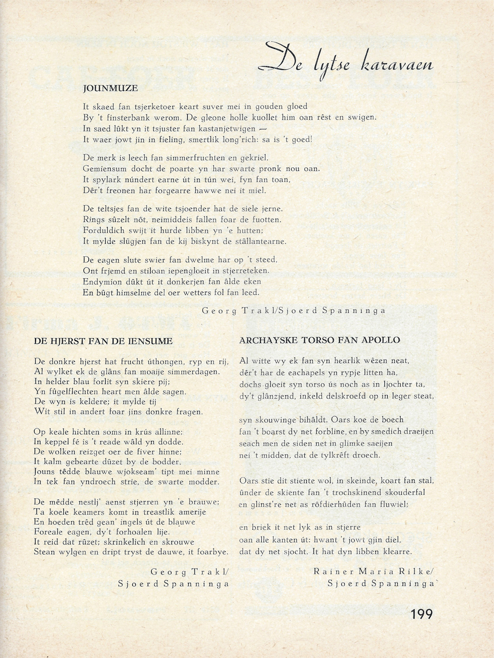 - Georg Trakl, ‘Jounmuze’, ‘De hjerst fan de iensume’, oers. Sjoerd Spanninga, It Heitelân, 1953, nû. 12 (desimber 1953), s. 199.